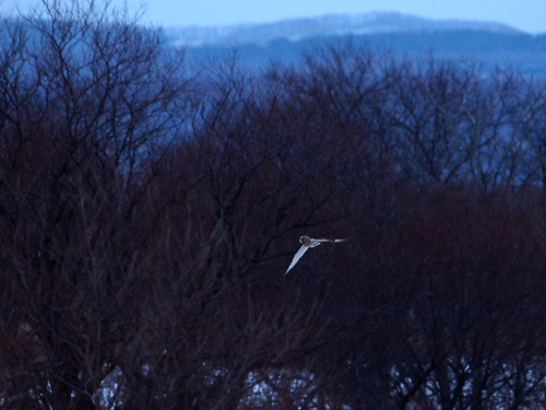 暗くなった林縁に コミミズクの羽が白く浮き上がって見えます