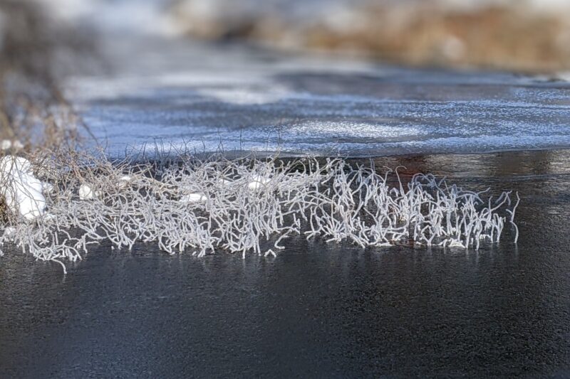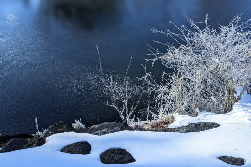 ほとんど結氷した池の一角に わずかに残った解氷面と 霧氷