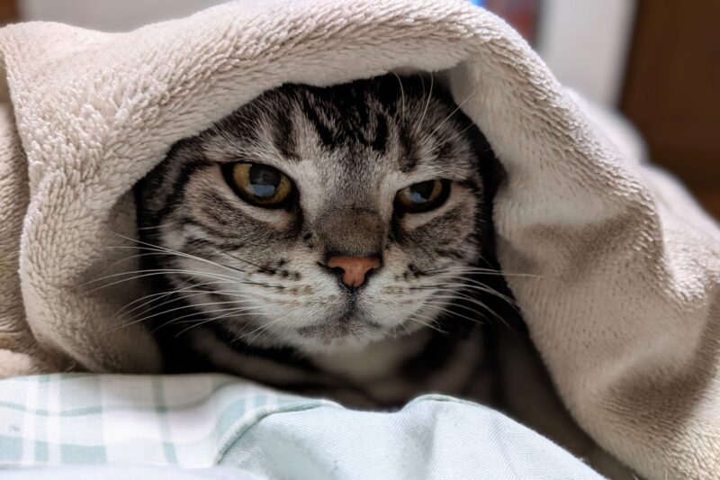 ベランダも雪まみれで しょぼんの猫サワラ