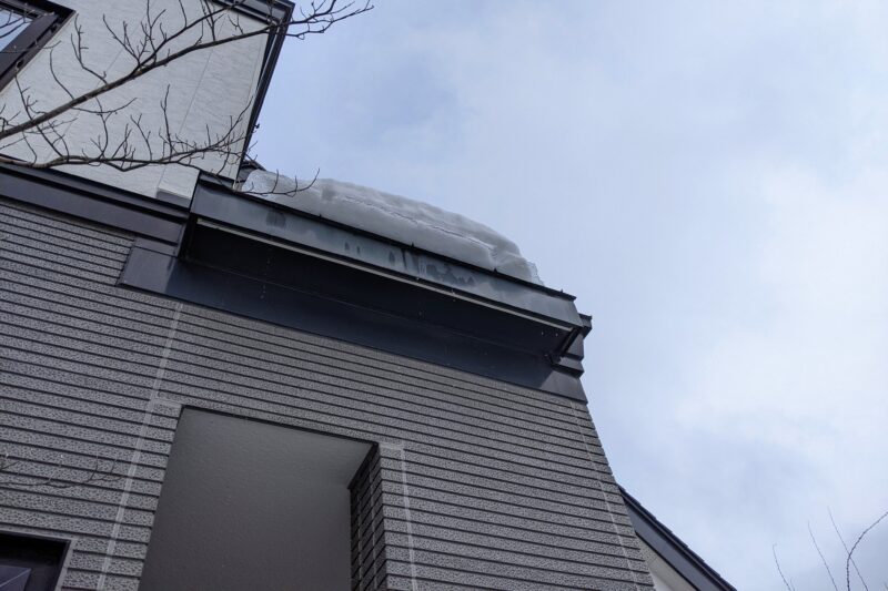 玄関の庇の上に積もった雪が 迫り出してきました(雪庇)