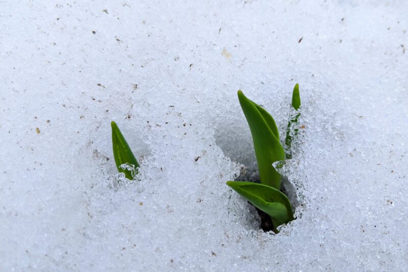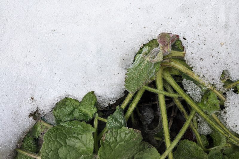 雪深い時に踏み締めた場所から 雪解けに伴って植物の新芽が出てくると、逞しい生命力を感じるね〜