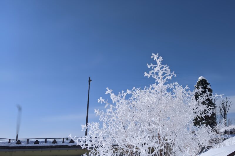 木の樹氷が美しいけれど、狭くなった雪道は危険がイッパイだわあ
